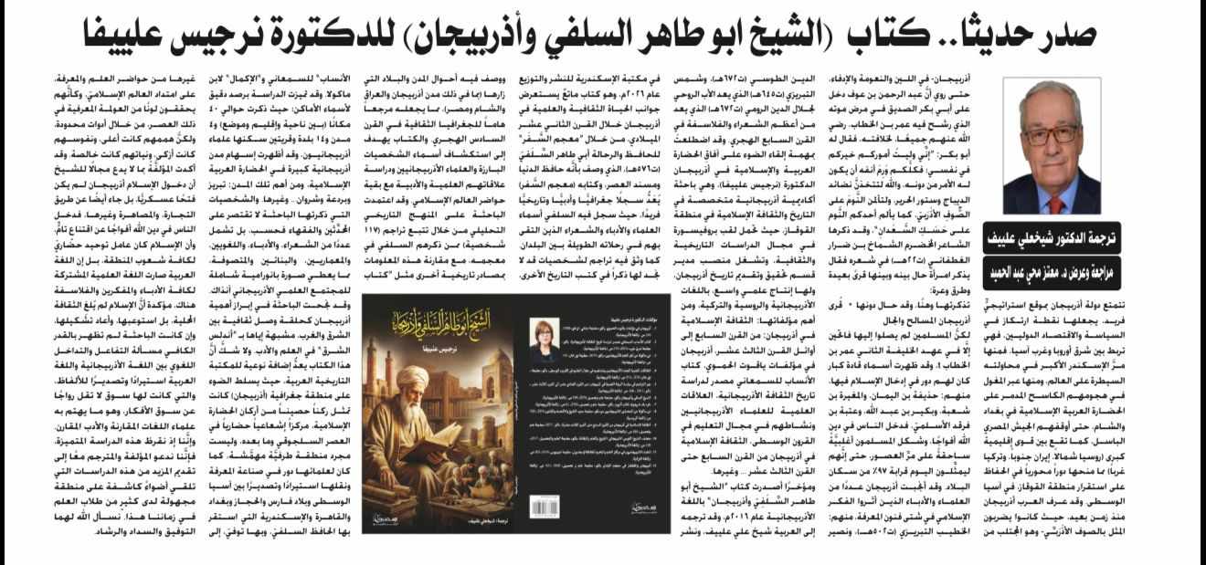 Статья о книге «Шейх Абу Тахир ас-Силафи и Азербайджан» заведующей Отделом научных исследований и презентации истории Азербайджана Национального музея истории Азербайджана, д.и.н., доцента Наргиз Алиевой, изданной на арабском языке в Египте, опубликована в иракской газете «аль-Биа аль-Джедида». Доктор Мутазз Мухи Абдульхамид, отмечает, что работа отражает важные научные аспекты изучения истории и культуры средневекового Азербайджана. Следует отметить, что эта книга, предназначенная для арабоязычных читателей, основана на труде «Муджам ас-Сафар» шейха Абу Тахира ас-Силафи, суфийского ученого и путешественника, посетившего Азербайджан в XII веке. В книге подробно исследуется богатая культурная жизнь Азербайджана того периода, основанная на наблюдениях ас-Силафи. Учёный из Александрии высоко оценил достижения Азербайджана в области науки и литературы, назвав его «Андалусией Востока». В работе представлена ценная информация о 117 выходцах из Азербайджана - мухаддисах, факихах, суфийских шейхах, хафизах, поэтах, секретарях и писателях. Этот источник имеет особое значение с точки зрения раскрытия личности азербайджанских интеллектуалов и видных деятелей, а также исследования научных и литературных связей между Азербайджаном и странами мусульманского мира. Главная особенность, отличающая Ас-Силафи от других путешественников, заключается в том, что он посетил азербайджанские города, расположенные как к югу, так и к северу от реки Араз, и непосредственно изучал научную и культурную среду этих регионов. В статье также отмечается, что Н.Алиева является автором ряда авторитетных научных работ по азербайджано-арабским культурным связям и средневековой истории. Книгу на арабский язык перевёл д.ф.п.ф. Шихали Алиев.
