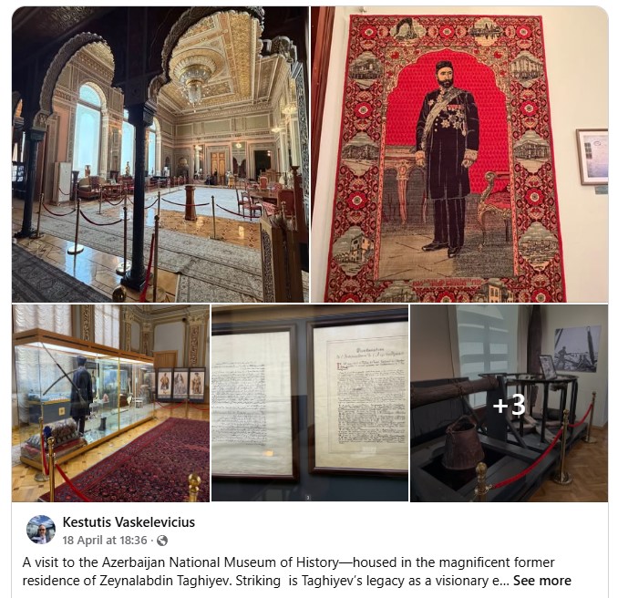 Чрезвычайный и Полномочный Посол Литовской Республики в Азербайджане Кестутис Вашкелевичус посетил Национальный музей истории Азербайджана и поделился своими впечатлениями на своей странице в Facebook. Господин посол отметил, что музей расположен в великолепной бывшей резиденции видного азербайджанского предпринимателя и мецената Зейналабдина Тагиева. В своем посте он подчеркнул, что наследие Тагиева как дальновидного предпринимателя и мецената заслуживает особого внимания, и отметил, что оно напоминает о роли индивидуальной инициативы в формировании истории страны и ее социального развития. Посол отметил, что музей представляет экспозицию, включающую экспонаты, начиная от древних артефактов до элегантных интерьеров конца XIX - начала XX веков. По словам посла, это богатство позволяет составить более полную картину идентичности, толерантности и культурного наследия Азербайджана. Кестутис Вашкелевичус также отметил, что значительная часть экспозиции посвящена истории нефтяной промышленности в Баку, который когда-то являлся мировым пионером в этой сфере По словам посла, Национальный музей истории Азербайджана имеет огромное значение для более глубокого понимания прошлого страны и пути ее развития. Подробности по ссылке